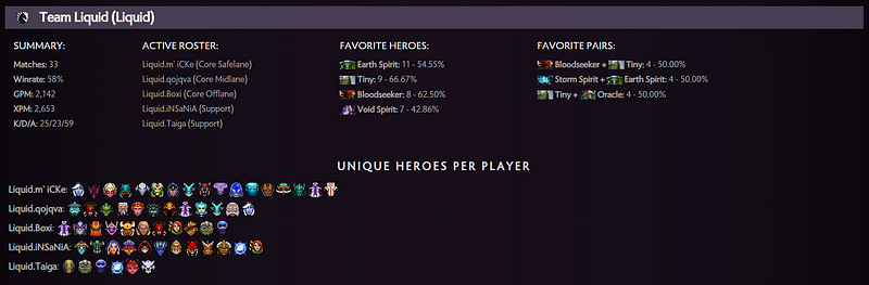 Teams profiles also got a new component, showing icons of all the unique heroes a player played during an event