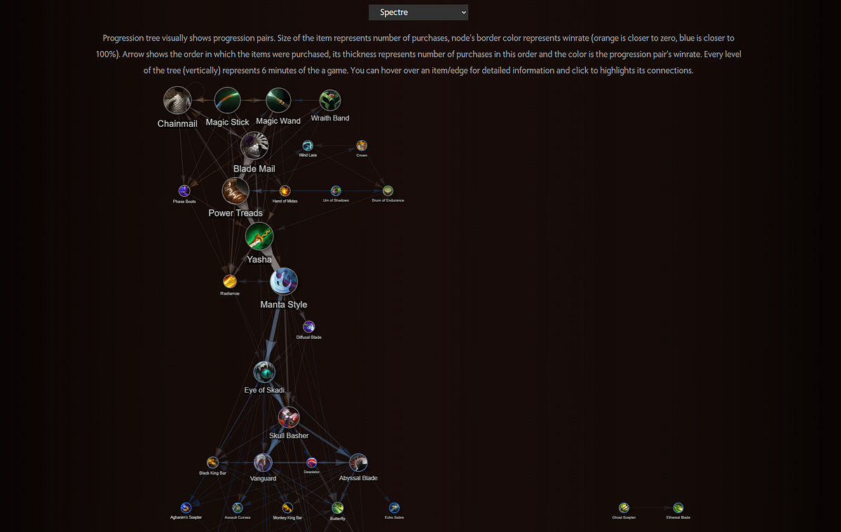 But items pairs are not as interesing as item progression combos. These are items that were bought one after the other. It may be represented as a table, but the most interesting part is Progression Tree — a graph representing “average” item build.