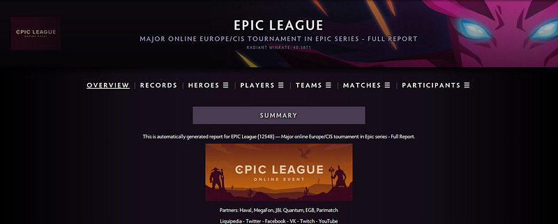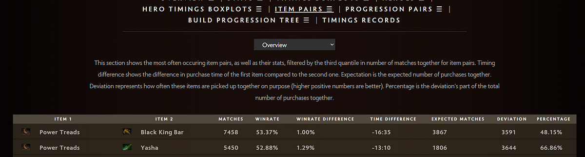 These are the most boring components. Records has the earliest item timings on the event (in the report), items overview shows some of the most impactful items with the highest positive/negative effect on winrate, as well as records for items with the highest winrate gradient per minute.