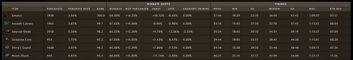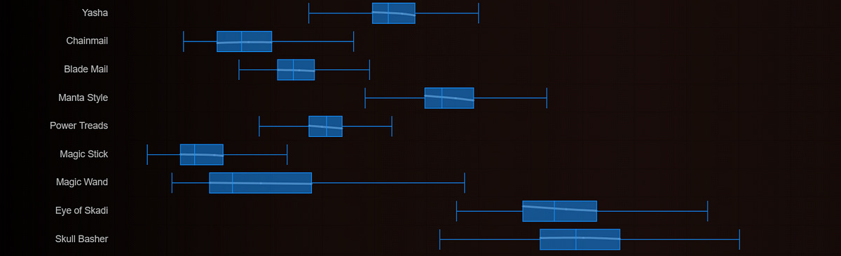 Boxplots represent item timings (min, max, early and late timings, median timing), as well as winrate (white line inside of the box).
