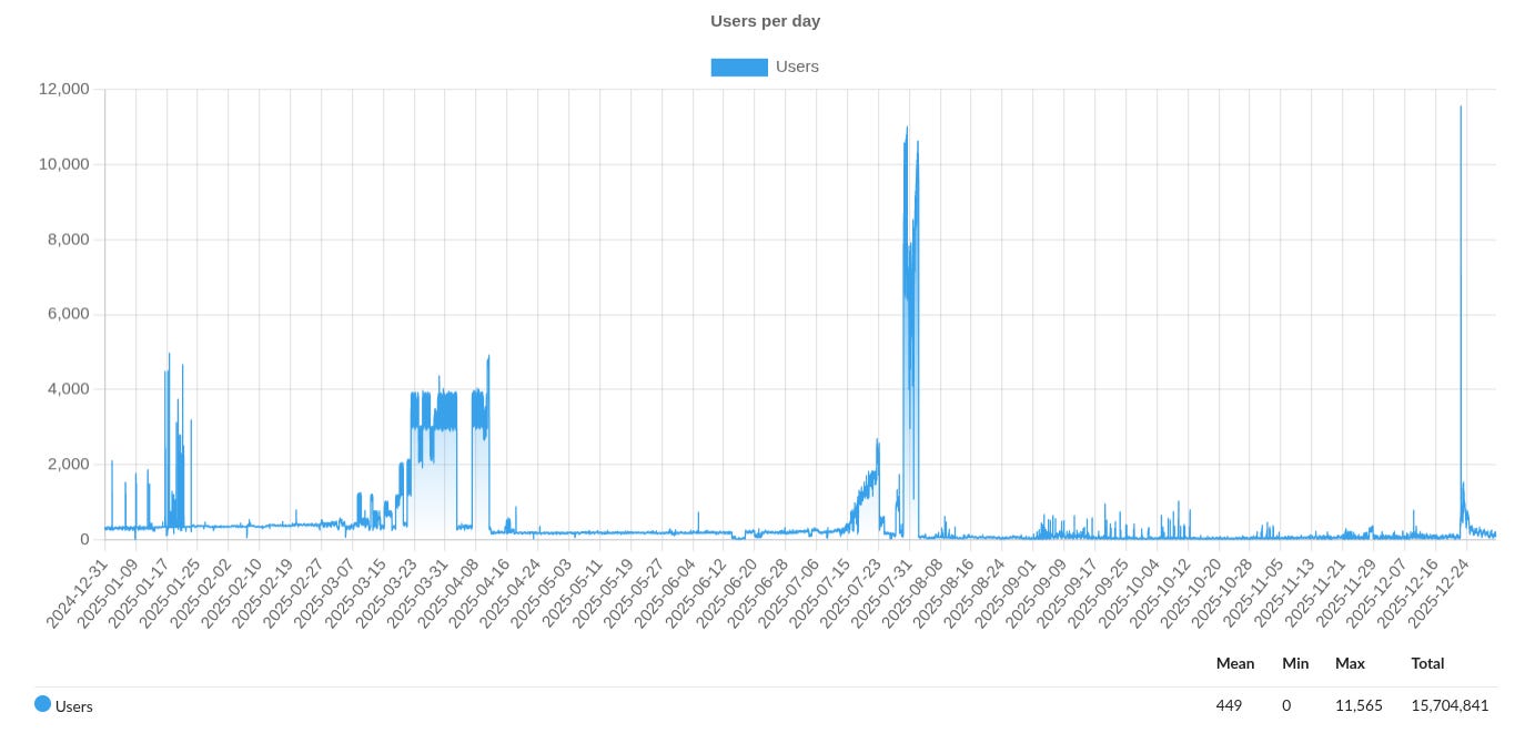 First of all, one could clearly see the surges in bot traffic multiple times throughout the year, as well as the points when I decided to make the cloudflare protection more tight.