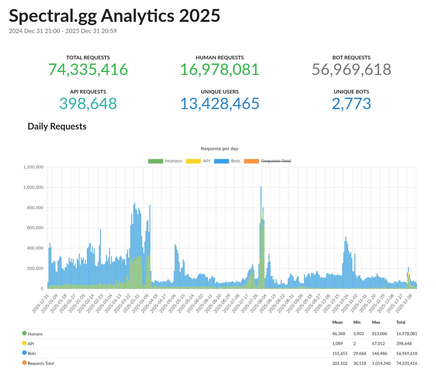 This year’s analytics report was a bit cleaner than last year. Though I sort of broke the analytics tool for a bit there, the nature of the bug didn’t affect the results. That said, the human vs bot detection was adjusted throughout the year.