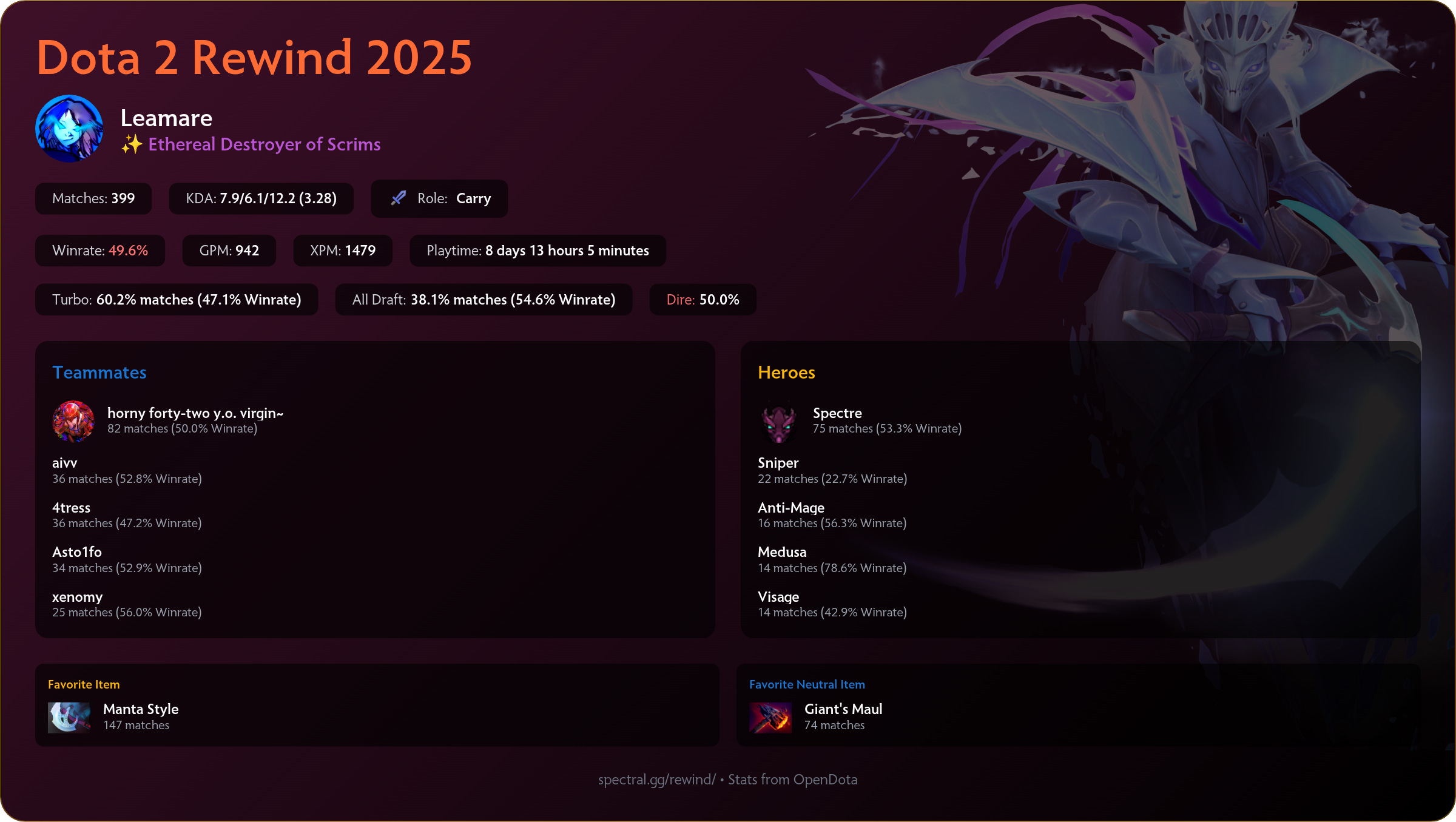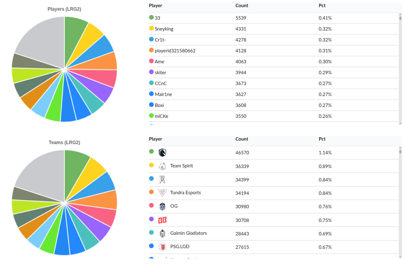 Neta 33, Sneyking and Cr1t are still the most beloved players in the spectral reports, with Yatoro and Ame coming in shortly after that. In the teams section, however, there were quite a lot of shifts this year. Team Spirit came with the 2nd place in popularity, LGD fell off, BB Team and Tundra joined the top-10, and EG/Shopify still remain in the top-3, even after the team was disbanded.