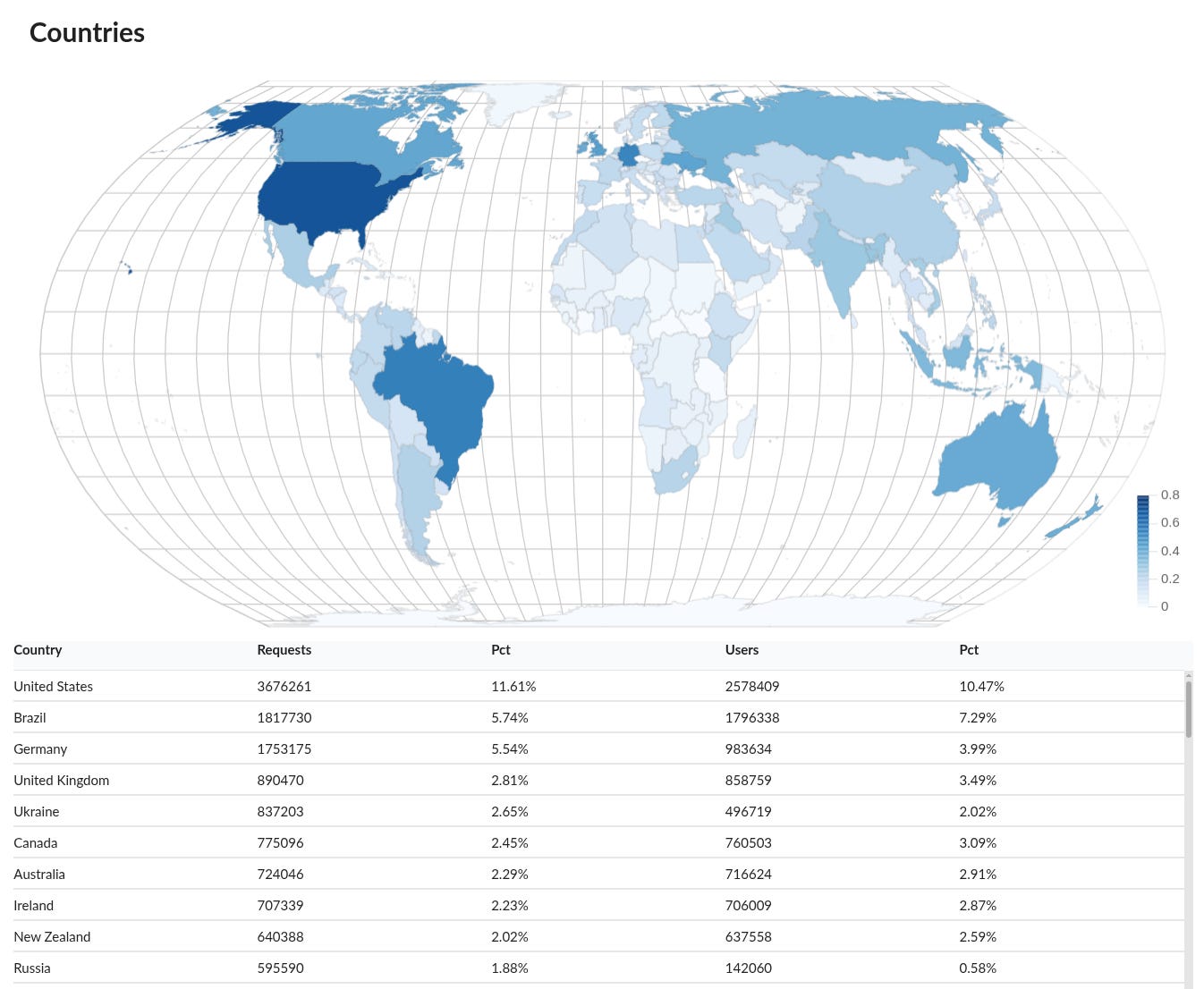 The not-so-surprising thing was the requests from Russia falling off: after the blocks became even stronger, about 70% of users reported issues with accessing the main site. That said, the percentage of users with ru locale chosen decreased not by much, likely meaning that most of the users are using VPNs or similar technologies. Uniquely, 215 unique users were using Emoji locale (which is less than 0.01%, but hey!)
