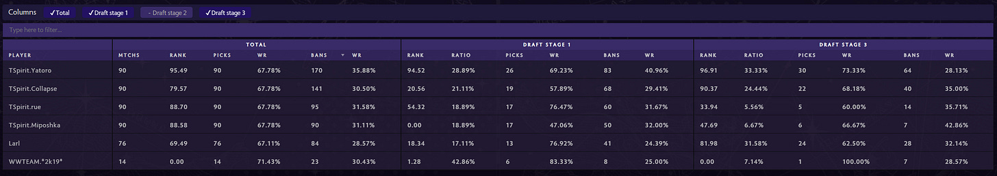 My favorite feature of the bunch was, however, "player targeted bans estimation": basically deducing what bans were probably targeted at a specific player on a team and recalculating bans for draft tables based on that. Looks fancy, and it also gives an insight into how the opponents see the player.