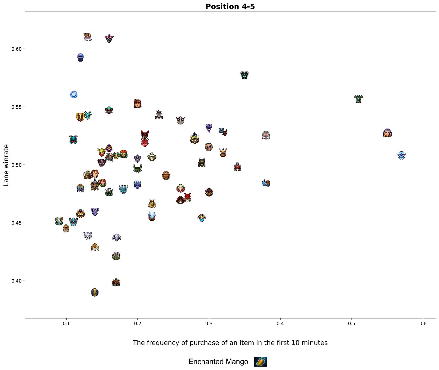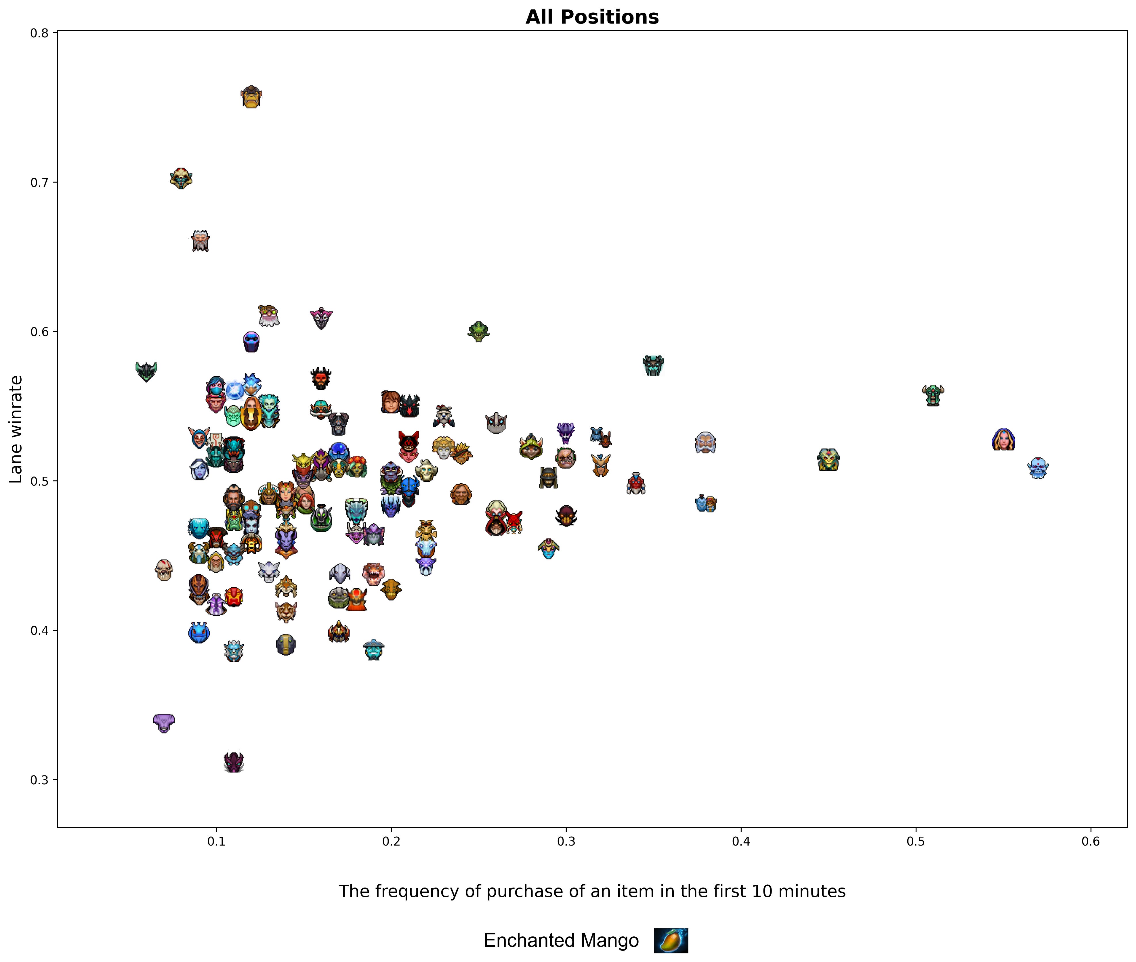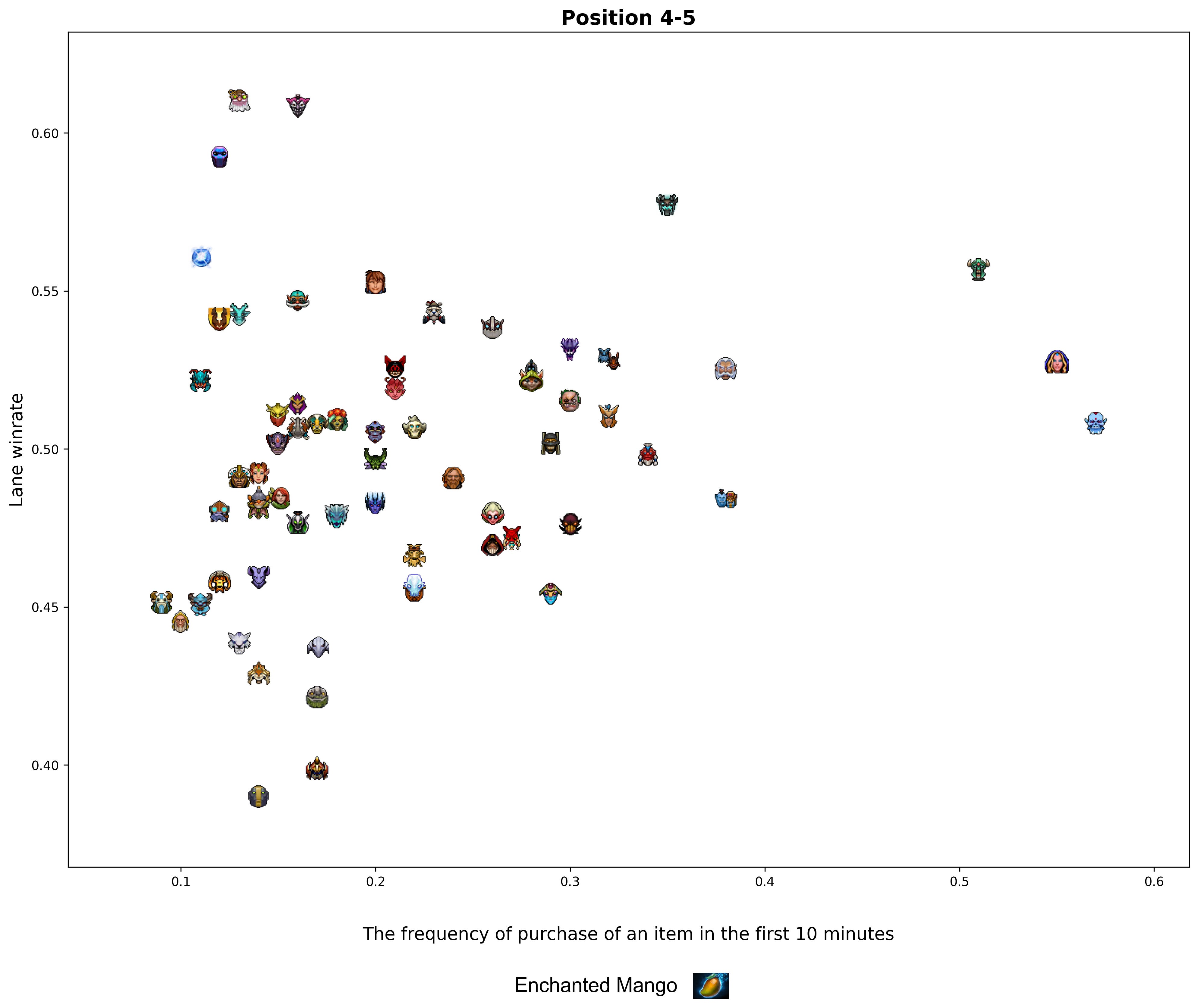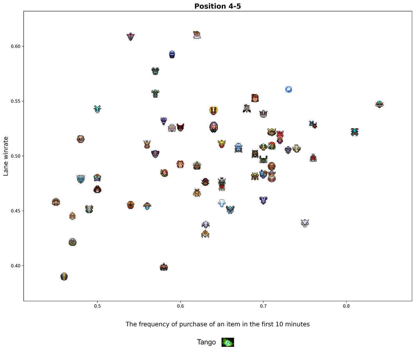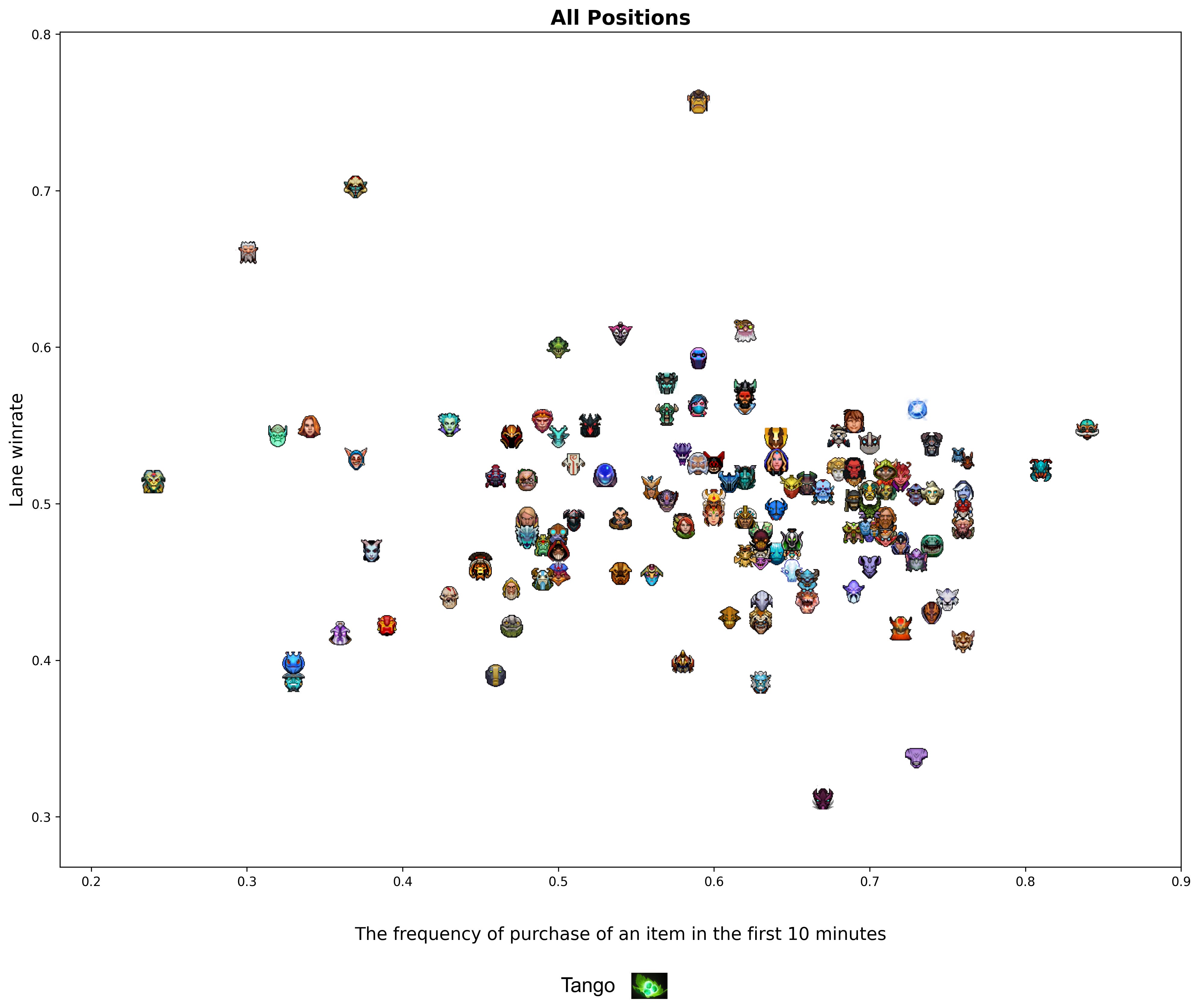 With a fellow friend Casual (analyst of Avulus team) we took a look at the lane winrate vs mean purchases of an item by a hero. To reduce the number of complicated operations, we used the main hero laning stats (not divided by role), but still filtered heroes with less than 5% of their matches on a certain role to hide irrelevant data.