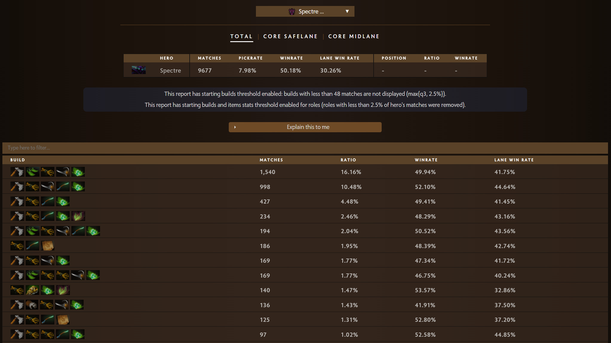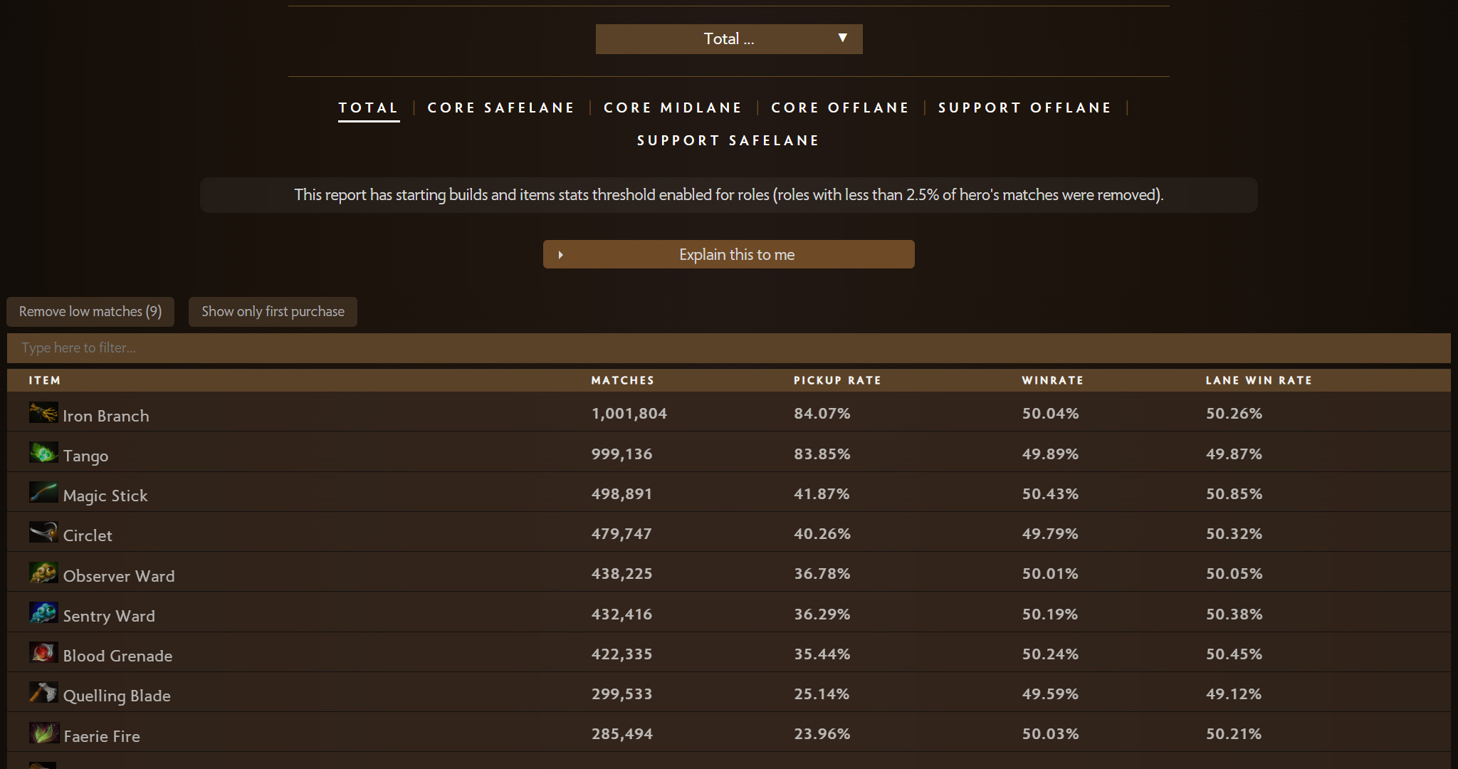 Every item has the number of matches when this item was purchased, overall purchase rate, winrate and also lane winrate (helping to see average laning impact). Toggle filters allow to hide any sequential purchases and purchases with the low number of matches.