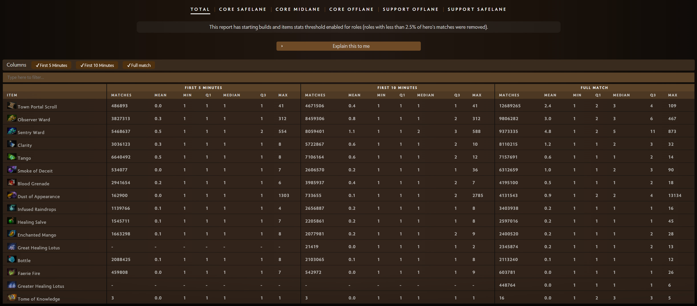 So while it was in the works for a while, it didn't really change much for the past two years and was available as an Early Preview feature. Even the code for data processing didn't really change that much after the first major version. Because of that, starting items, builds and consumables sections are supported by all Immortal Rank Meta Trends reports since 7.35d and some competitive events before and after that (though data quality may differ from immortal rank report to report).